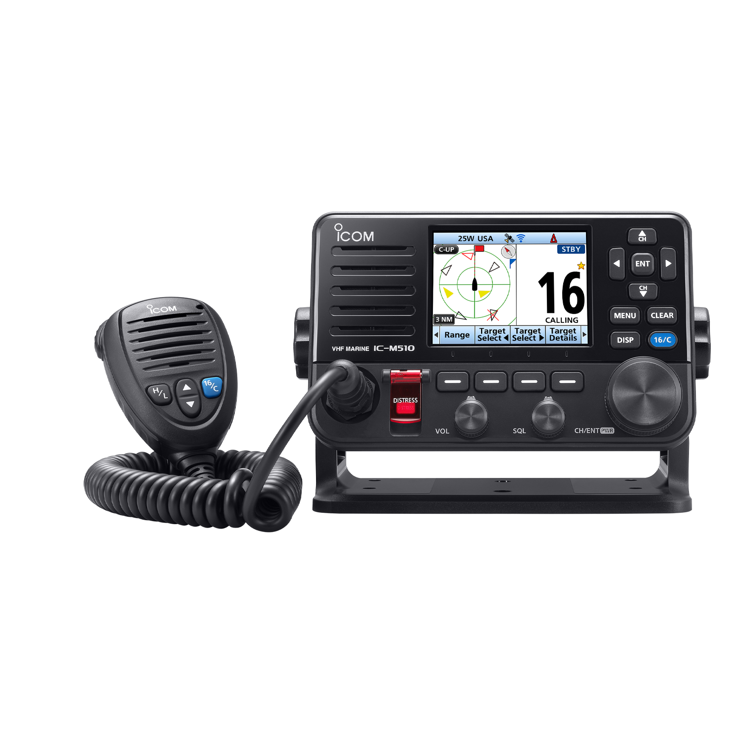The IC-M510 is slim (depth: 53.6 mm; 2.1 in) and easy to install in your boat. It’s all-new sleek design is suitable for either panel or trunnion mounting.
